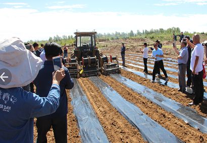 2018年7月20日,在甘肃省甘州区花寨乡柏杨树村春绿蔬菜种植基地,一台由甘州区农机技术推广站和甘州区春绿农机合作社从浙江联辉智能科技有限公司公司引进的LF-C800型北斗导航自动驾驶系统正牵引一台三行铺膜机进行铺膜作业。